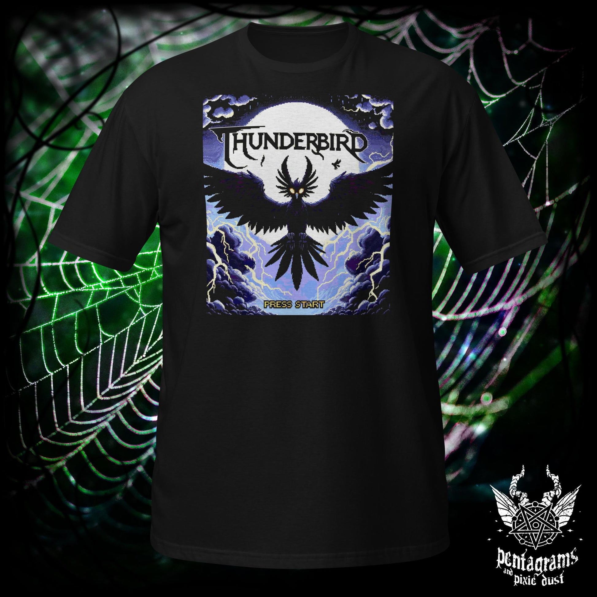 Soar into the realm of myth and pixel art with the Thunderbird - Cryptid Game Art Series T-Shirt. This striking black tee showcases a vibrant pixel art illustration of the legendary Thunderbird, styled reminiscent of an epic video game start screen. The artwork masterfully blends the powerful symbolism of the Thunderbird, a creature steeped in indigenous lore and mythology, with the nostalgic charm of retro gaming graphics. Ideal for aficionados of cryptids, cultural legends, and classic gaming, this t-shirt is more than just a garment—it's a wearable piece of art that captures the spirit of ancient tales and digital adventure. Whether you're attending a cultural event, a gaming convention, or just expressing your unique style, the Thunderbird t-shirt is a bold statement of your appreciation for the mysterious and the legendary.